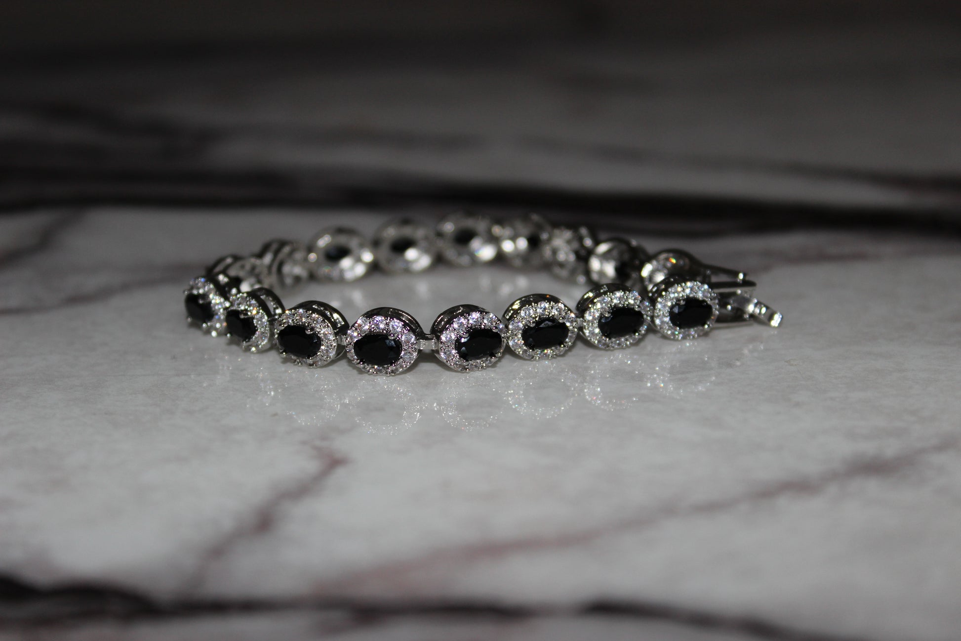 The Black Glacier Link Bracelet sets jet-black simulated stones inside pavé-lined links for a clean, high-contrast shine. Finished in polished silver-tone with a secure clasp built for daily wear.
